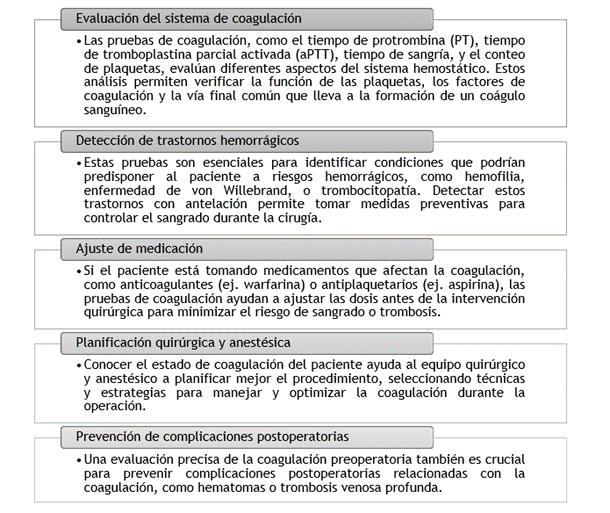 Dentro de los exámenes preoperatorios, las pruebas de coagulación son fundamentales para evaluar la capacidad del paciente de coagular la sangre adecuadamente. Estos análisis ayudan a identificar cualquier anomalía que podría llevar a sangrados excesivos o a la formación de coágulos durante o después de la cirugía.(4)
