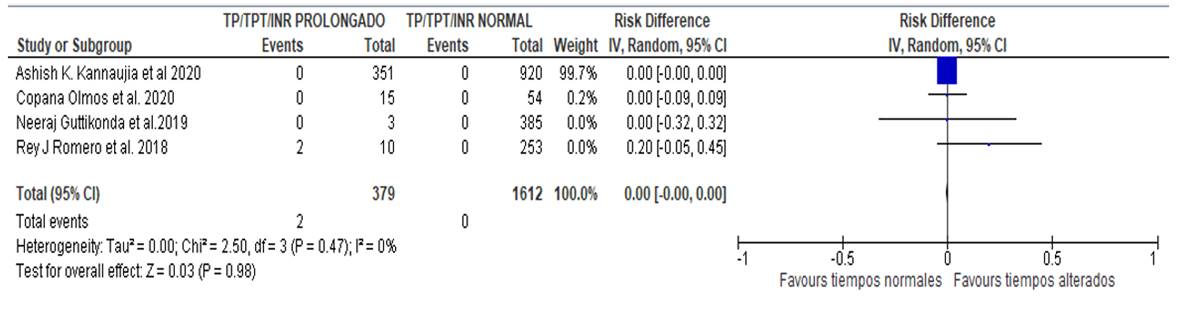 Sustentado en la revisión realizada, es posible señalar que no hay una correlación estadísticamente significativa entre las alteraciones en los tiempos de coagulación y el aumento del riesgo de eventos hemorrágicos en el periodo intraoperatorio. Esto se sustenta en un Riesgo Relativo (RR) de 0, evidenciando la falta de asociación entre la intervención quirúrgica y el factor de riesgo mencionado. Estos resultados adquieren relevancia estadística al considerar un intervalo de confianza del 95%, con un valor de P < 0.5, lo que sugiere una buena homogeneidad entre las variables estudiadas. Además, un test de efecto Z con un valor de P > 0.5 en el metaanálisis confirma la ausencia de asociación.